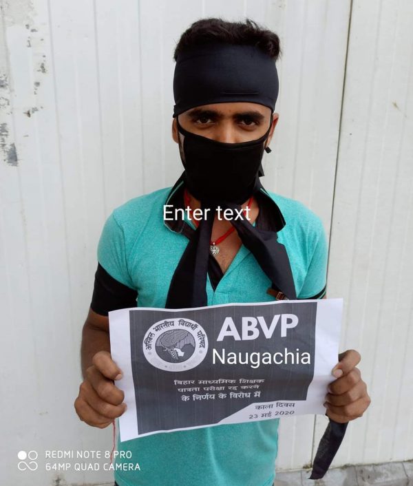 अखिल भारतीय विद्यार्थी परिषद की नवगछिया इकाई के सदस्यों ने बिहार सरकार द्वारा एसटेट परीक्षा परिणाम आने के पहले रद्द करने पर काला बिल्ला लगाकर एवं पट्टी बांध कर विरोध जताया। प्रदेश कार्यकारिणी सदस्य अनुज चौरसिया ने बताया कि जब हाईकोर्ट का निर्णय 22 को आना था तो 16 को ही जल्दबाजी में एसटेट की परीक्षा रद्द क्यों की गयी।