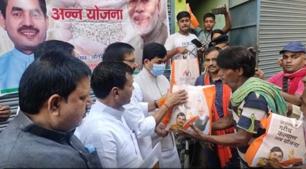 साथ ही गोशाला रोड में डीलर विश्वनाथ गुप्ता की दुकान पर उद्योग मंत्री द्वारा प्रधानमंत्री गरीब कल्याण योजना के तहत लाभार्थियों के बीच अनाज सहित थैला का वितरण किया गया।