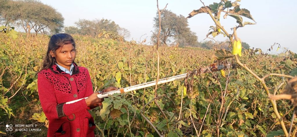 नवगछिया – यह कहानी नवगछिया अनुमंडल के रंगरा प्रखंड के सीमांत गांव सधुवा दियारा की सातवीं कक्षा की छात्रा मनीषा की है. मनीषा के पिता उत्तम सिंह एक छोटे किसान हैं और पशुपालन के साथ-साथ सब्जियों की खेती करते हैं. बैगन तोड़ने के क्रम में अक्सर मनीषा के पिता के हाथों में जख्म हो जाता था, जख्म ने धीरे धीरे घाव का रूप ले लिया और उत्तम सिंह बैंगन तोड़ने में असमर्थ हो गए. पिता के दर्द को देखते हुए 4 माह के अथक प्रयास से एक यंत्र का आविष्कार किया जो मनीषा के पिता के लिए ही नहीं बल्कि आसपास के किसानों के लिए मील का पत्थर साबित हुआ. मनीषा अपने इस यंत्र को सब्जी तोड़ने वाला मशीन कहती है लेकिन मनीषा के स्कूल टीचर ने इस मशीन को नाम दिया है वेजिटेबल पीकर.