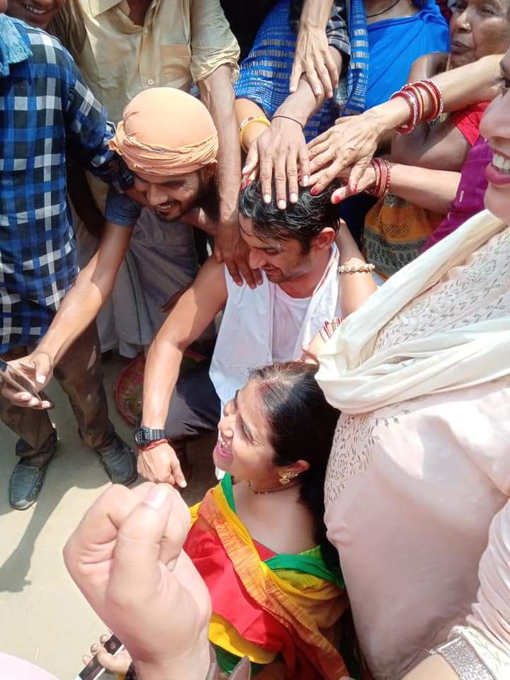 खगड़िया (चौथम) : सिने स्टार सुशांत सिंह राजपूत सोमवार को अपना मुंडन कराने बोरने स्थित भगवती मंदिर पहुंचे. जहां सुशांत सिंह राजपूत की एक झलक पाने के लिए खगड़िया के युवा और युवती बेताव दिख रहे थे. नाव से बागमती नदी पार अभिनेता अपने ननिहाल गांव बोरने स्थान पहुंचे थे. जहां ऐतिहासिक माता भगवती के मंदिर में सामाजिक रीति रिवाज के साथ सुशांत सिंह राजपूत का मुंडन संस्कार हुआ.