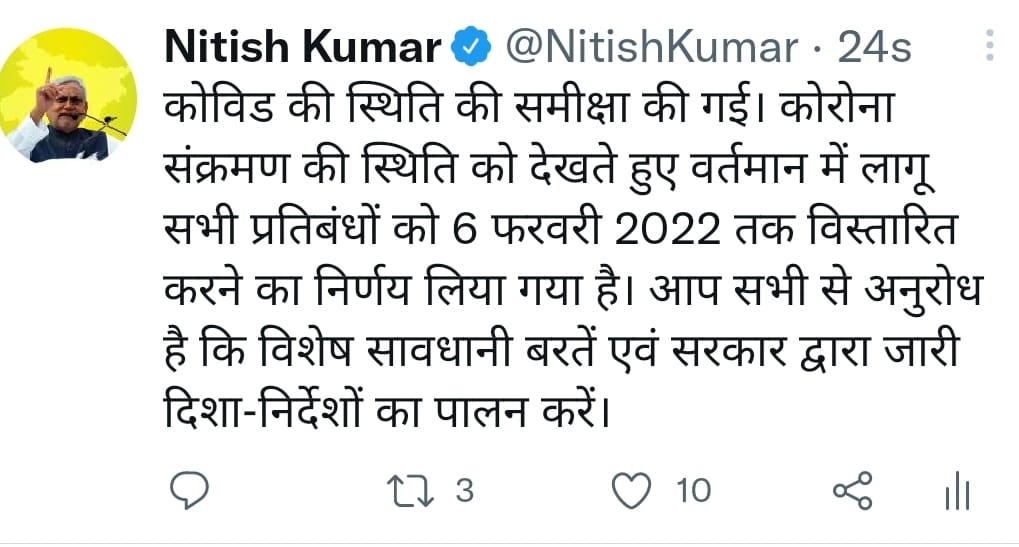 Thank you for reading this post, don't forget to subscribe!प्रदेश में कोरोना को लेकर जो गाइडलाइन चल रही है, उसकी मियाद कल 21 जनवरी को पूरी हो जाएगी। उसके बाद शनिवार 22 जनवरी से नई गाइडलाइन लागू हो जाएगी। माना जा रहा है कि कोरोना की तीसरी लहर बहुत घातक नहीं है और लगातार कोरोना के संक्रमण में कमी भी आ रही है। CM नीतीश कुमार ने सोशल मीडिया पर आज के निर्णय की जानकारी देते हुए लोगों से सावधानी बरतने की अपील की है।