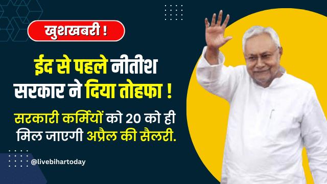 बिहार के सरकारी सेवकों और पेंशन भोगियों को ईद-उल-फितर का तोहफा दिया गया है। सरकारी कर्मी अप्रैल महीने का वेतन कल यानी 18 तारीख से पैसे निकासी कर सकेंगे। वित्त विभाग ने वेतन भोगियों और पेंशनभोगी के वेतन भुगतान और पेंशन भुगतान को लेकर निर्देश जारी कर दिए हैं।